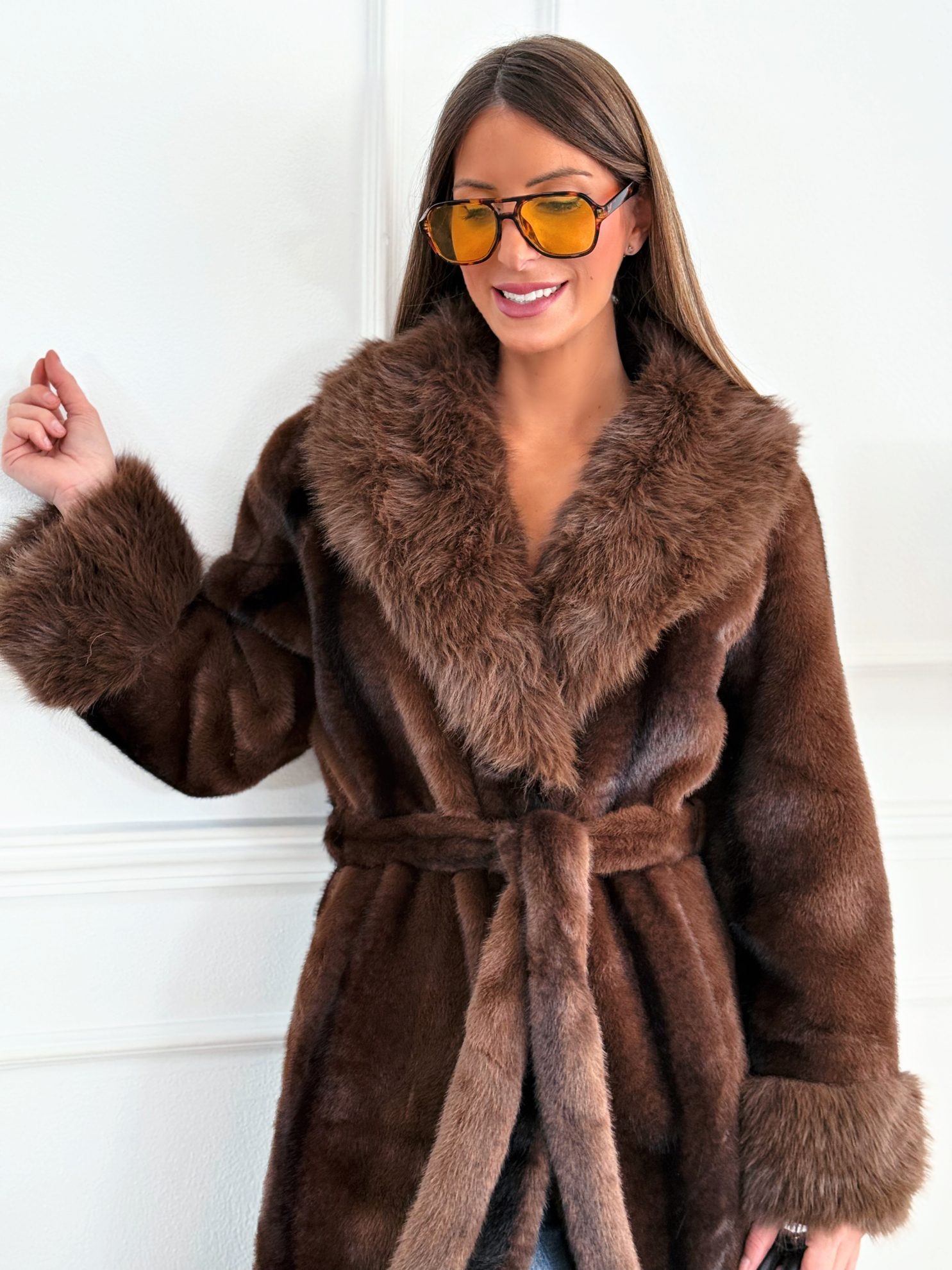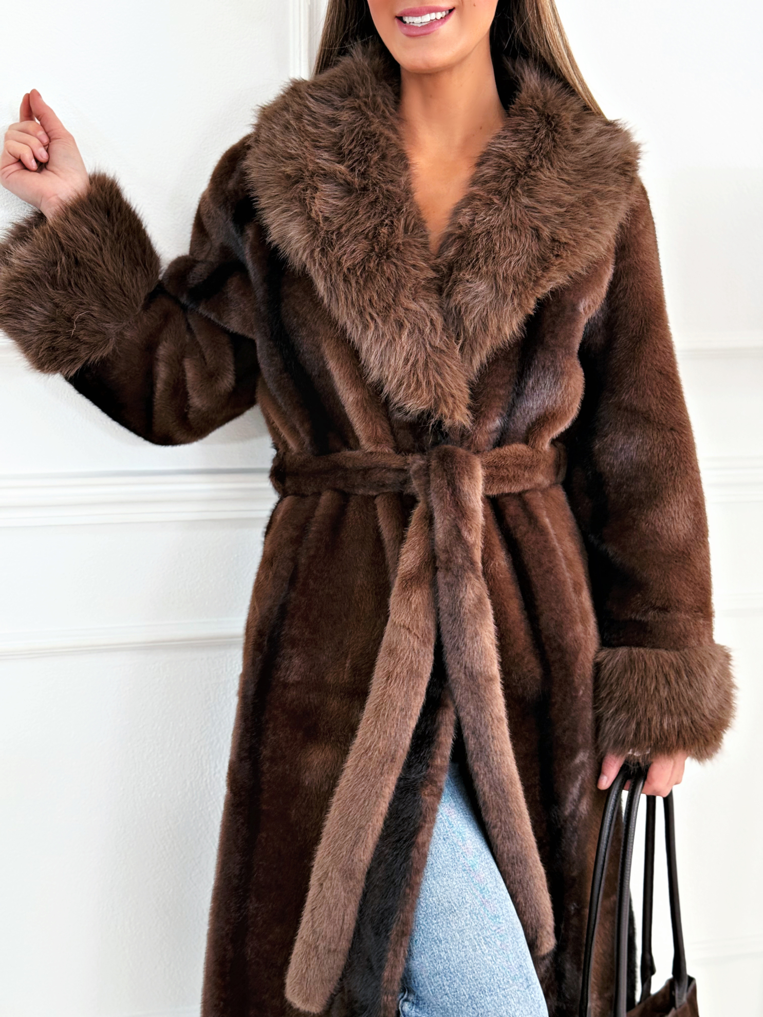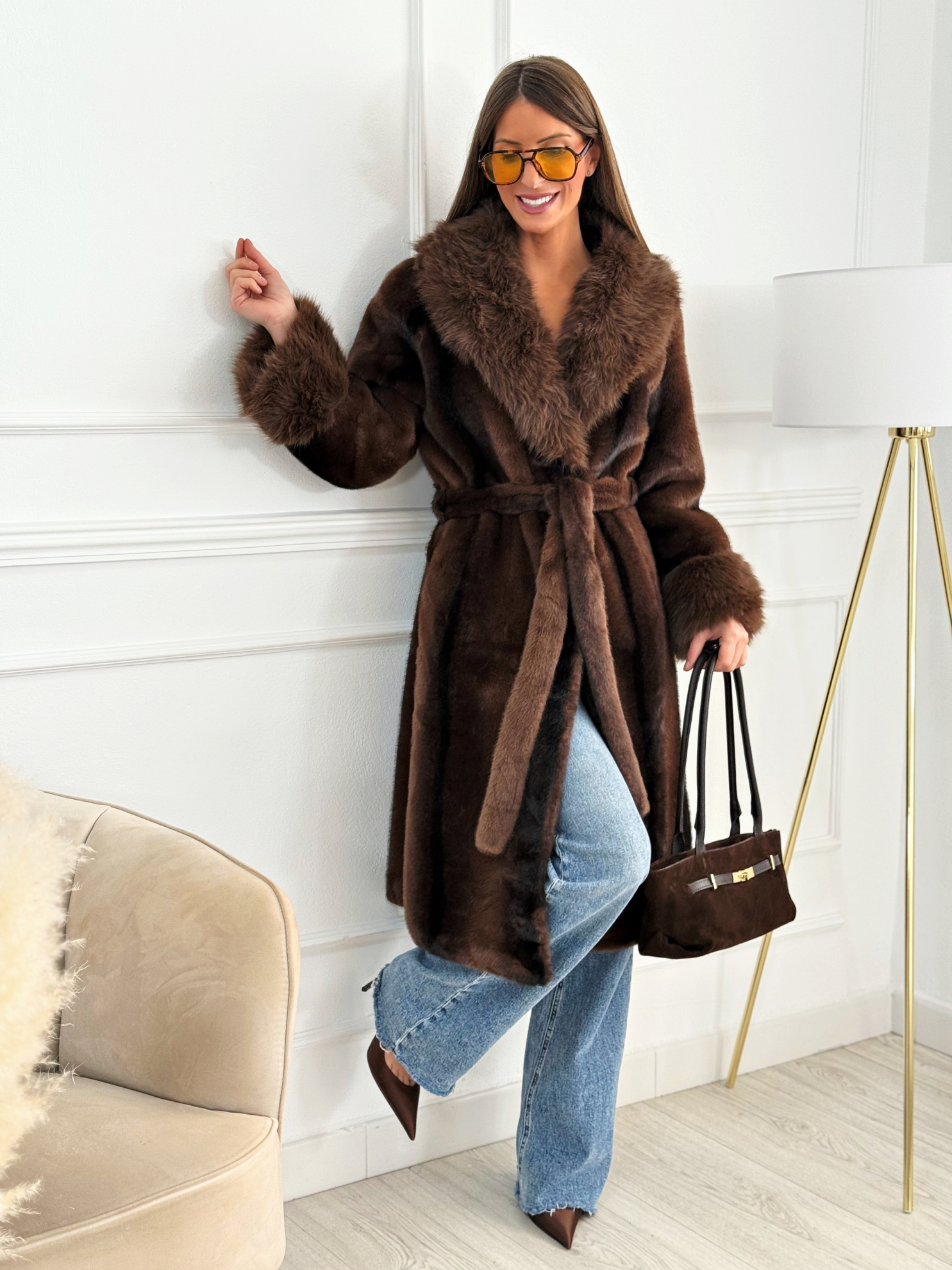 Este abrigo de pelo chocolate es una prenda imprescindible para quienes buscan estilo y comodidad en los días fríos. Su diseño largo aporta un efecto estilizado y muy chic, mientras que su textura suave y esponjosa ofrece una sensación envolvente y cálida. Incluye cinturón para ajustar la cintura y potenciar la figura, además de un cuello y unos puños voluminosos que aportan un toque de glamour. Es perfecto para looks de día o noche, combinando fácilmente con vaqueros, vestidos o pantalones de vestir. Una prenda elegante, favorecedora y muy actual.