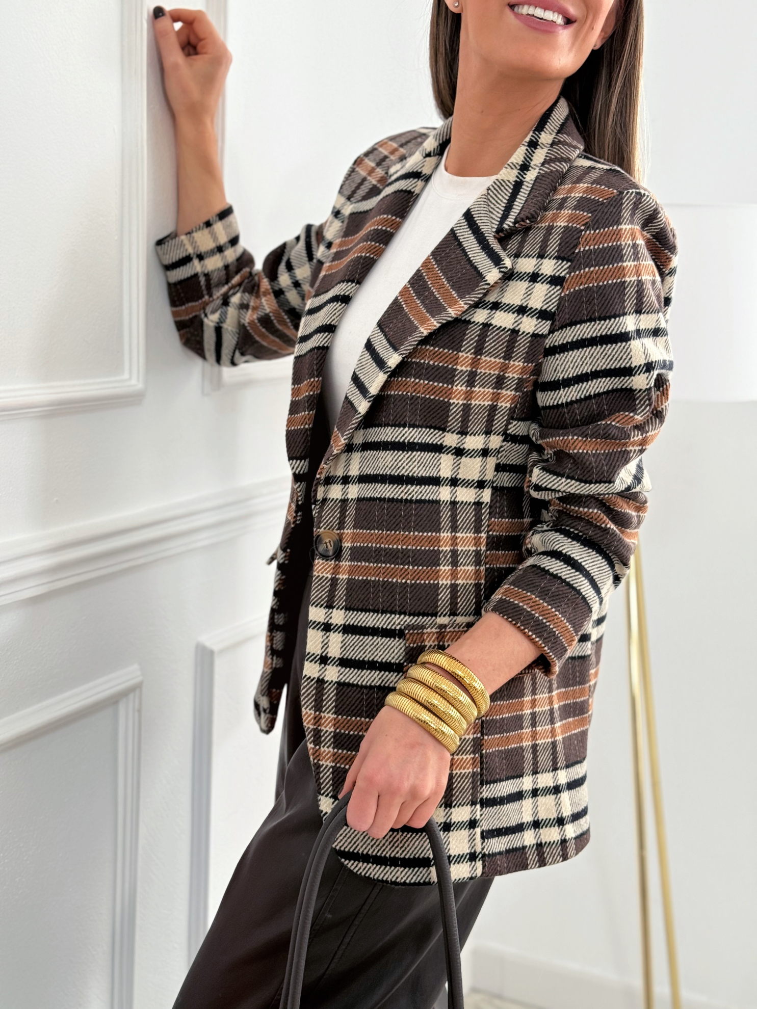 Esta blazer de paño con estampado de cuadros en tonos marrones, crema y negro es una prenda imprescindible para tus looks de otoño e invierno. Su tejido es cálido, suave y con la estructura perfecta para aportar estilo sin renunciar a la comodidad. La blazer cuenta con solapas clásicas, cierre frontal con botón y bolsillos decorativos que realzan su diseño. Su forro interior la hace más confortable y fácil de llevar durante todo el día. Es una pieza versátil que eleva cualquier outfit: vaqueros, pantalones de piel, vestidos o faldas. Una opción elegante, atemporal y muy combinable.