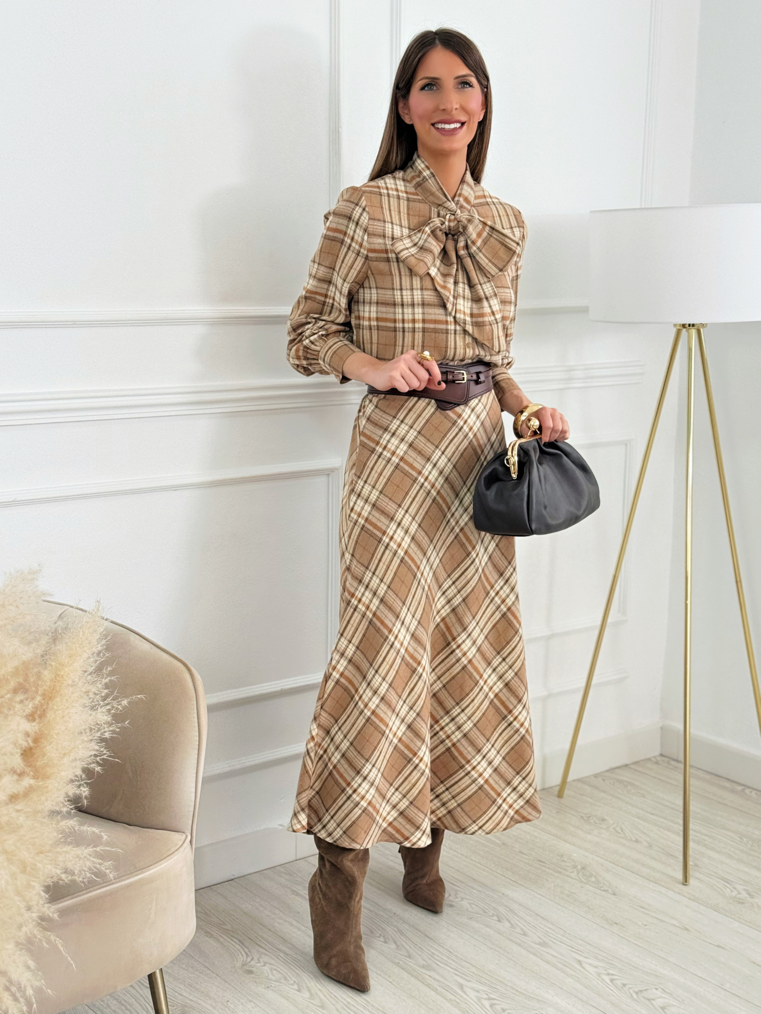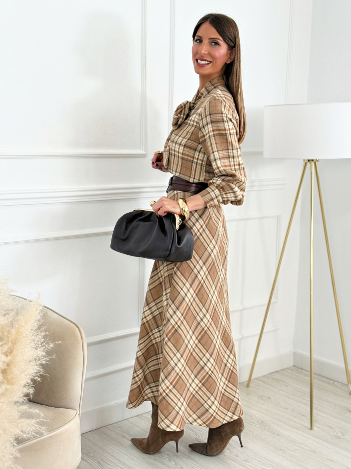 Blusa de cuadros en tonos tierra con un diseño muy femenino y sofisticado. Presenta un gran lazo delantero que aporta un toque especial, mangas largas con ligero volumen y un corte recto que estiliza y se adapta muy bien al cuerpo. Su tejido cálido mezcla poliéster y algodón, perfecto para llevar tanto sola como bajo blazers y abrigos. Una prenda versátil que funciona igual de bien para el día a día como para un look más arreglado.