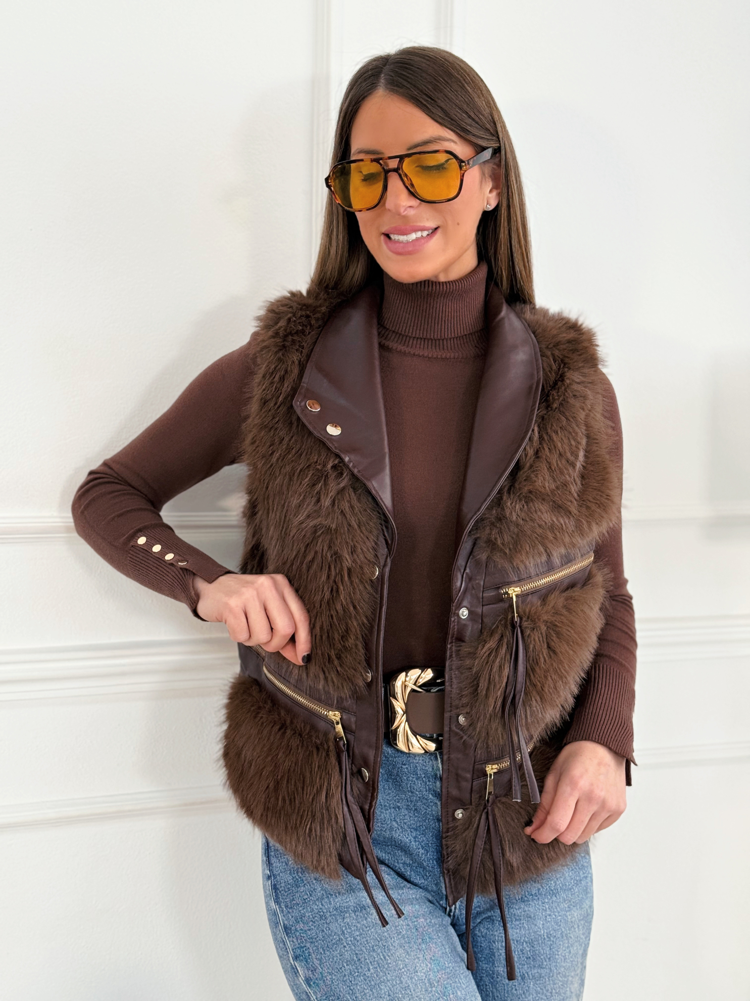 Este chaleco de polipiel en color burdeos combinado con pelo en tono chocolate es la prenda perfecta para elevar cualquier outfit. Su diseño mezcla el acabado elegante de la polipiel con la calidez y volumen del pelo, logrando un estilo moderno, favorecedor y muy combinable.