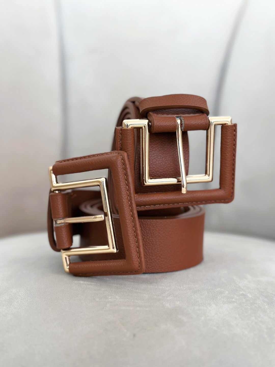 Cinturón en color camel con textura efecto piel y hebilla metálica rectangular en tono dorado. Su diseño ancho y estructurado lo convierte en el accesorio ideal para marcar la cintura y dar un toque elegante a vestidos, blazers o pantalones.