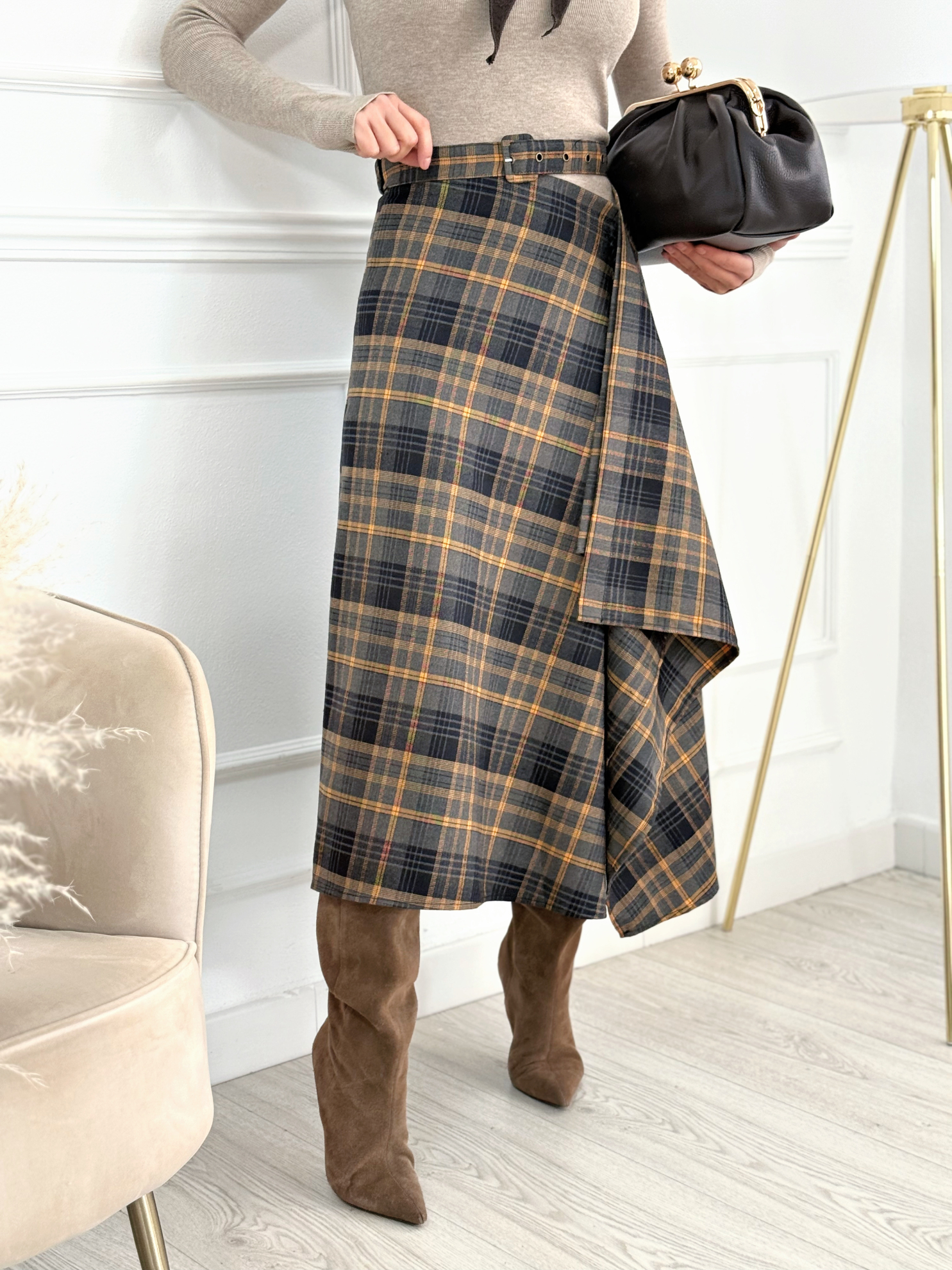 Esta falda midi de cuadros es una prenda versátil y muy favorecedora para crear looks sofisticados y actuales. Su diseño cruzado con caída lateral aporta movimiento y un efecto estilizado, mientras que el cinturón incluido permite ajustar la cintura para realzar la figura. El tejido combina poliéster, algodón y spandex, ofreciendo comodidad, estructura y un ligero punto elástico. Es una falda ideal para combinar con jerséis, camisas o básicos ajustados, perfecta para el día a día o para un look más especial. Su estampado en tonos neutros la convierte en una opción fácil de combinar durante toda la temporada.