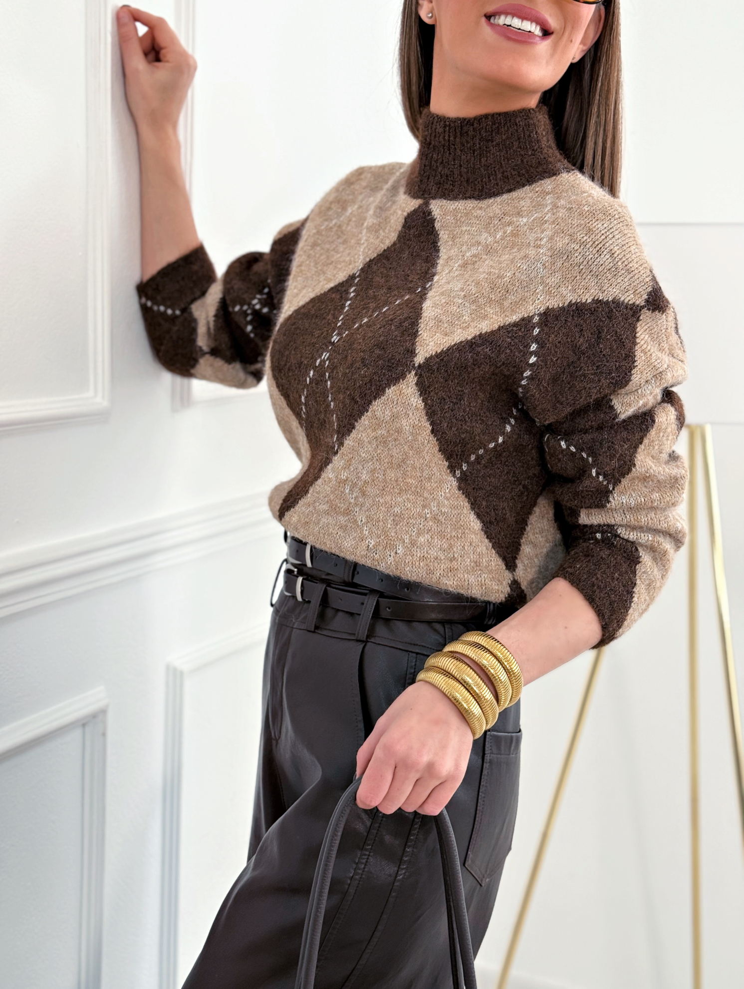 Este jersey de rombos en tonos beige y chocolate es una prenda ideal para la temporada gracias a su tejido suave, calentito y ligero. Su diseño clásico con dibujo de rombos aporta un estilo elegante y combinable, perfecto para looks del día a día o estilismos más cuidados. El cuello ligeramente subido añade un toque moderno y favorecedor, mientras que su talla única se adapta cómodamente a diferentes cuerpos, desde la 34 hasta la 42.