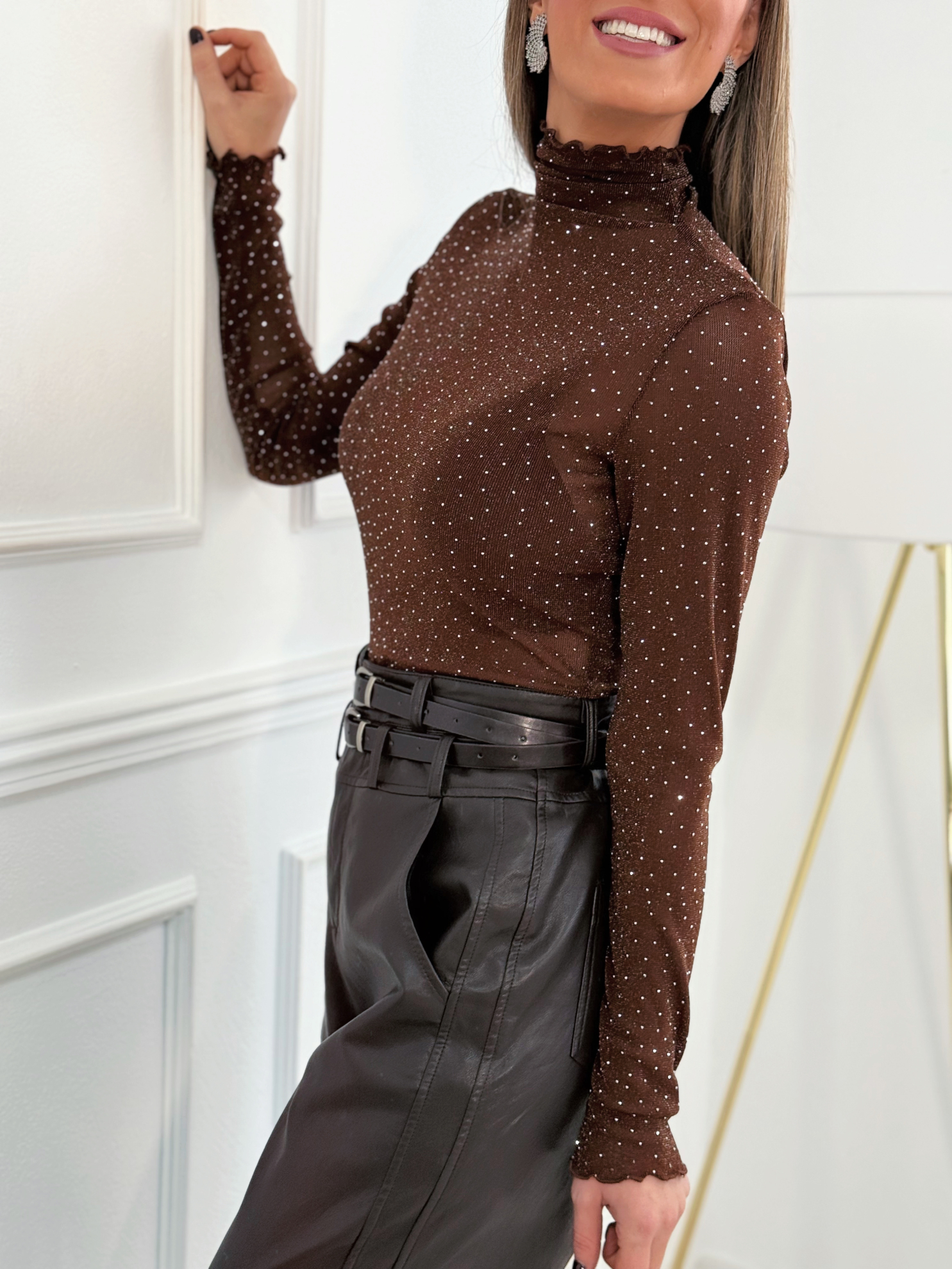 Nuestro top marrón brillante de cuello alto es una prenda ideal para crear looks elegantes y favorecedores. Su tejido elástico y con microdestellos aporta un acabado luminoso muy actual, mientras que su ajuste ceñido estiliza la figura y realza el cuerpo. Los detalles en el cuello y los puños añaden un toque delicado, convirtiéndolo en un top perfecto para combinar con pantalones de polipiel, faldas midi o jeans de tiro alto. Es una opción versátil tanto para eventos nocturnos como para elevar conjuntos del día a día.