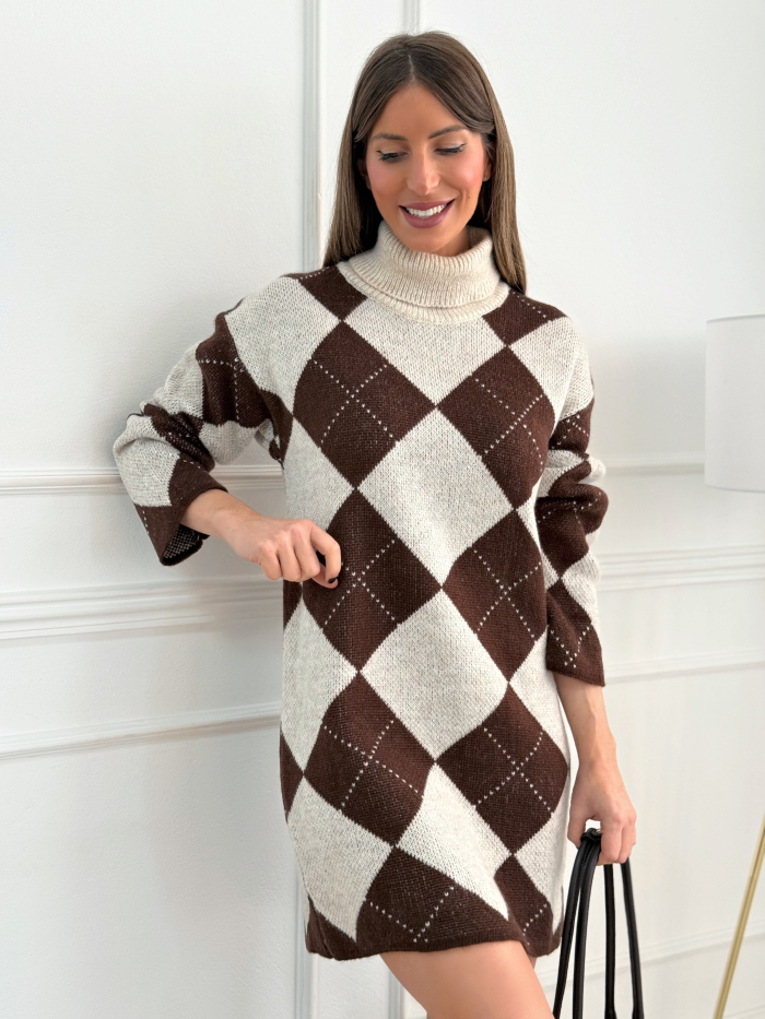 Vestido de punto de mujer. Estampado de rombos en tonos crudo y marrón. Cuello alto tipo cisne. Manga larga. Corte recto y cómodo. Tejido suave y agradable al tacto. Composición: 80% acrílico · 20% nylon.
